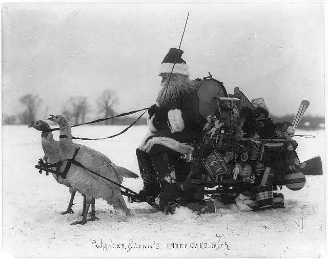 Santa Claus with Christmas toys on a sled drawn by white turkeys. ca. 1909. Schrader & Dennis, Three Oaks, Michigan USA.