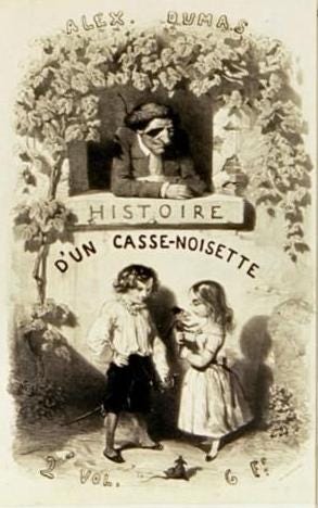 Title page of Alexandre Dumas' “Histoire d'un Casse-Noisette” showing Clara, Fritz and Drosselmeyer, which the Nutcracker ballet was based on. 1844. French. via wikipedia.org.