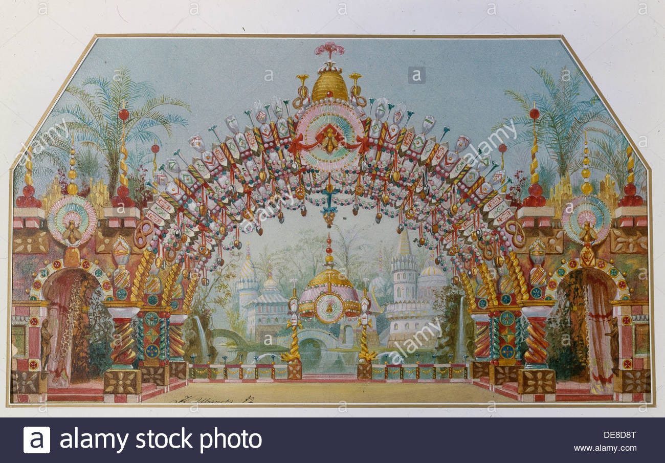 Set design for the 1892 premiere of Tchaikovsky's ballet “The Nutcracker” which was staged at the Imperial Ballet Theatre, Saint Petersburg. Russian. Konstantin Ivanov, creator (1859-1916). via alamy.com.