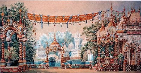 Set design for the Land of Sweets in Act II from the 1892 premiere of Tchaikovsky's ballet “The Nutcracker” which was staged at the Imperial Ballet Theatre in Saint Petersburg. Russian. via jadavisofmo.blogspot.com.