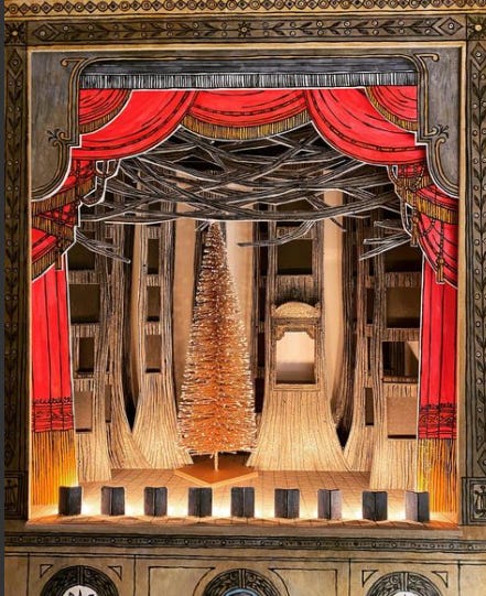 Paper theatre with a Christmas tree set. 2021. American. Vincent X. Kirsch, maker. paperboxplayhouses on Instagram. via Instagram.