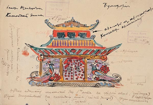 Chinese house concept for a 1919 production of Tchaikovsky’s ballet “The Nutcracker” that was staged at the Bolshoi Theatre in Moscow. Russian. Konstantin Korovin, creator. via tretyakovgallerymagazine.com.